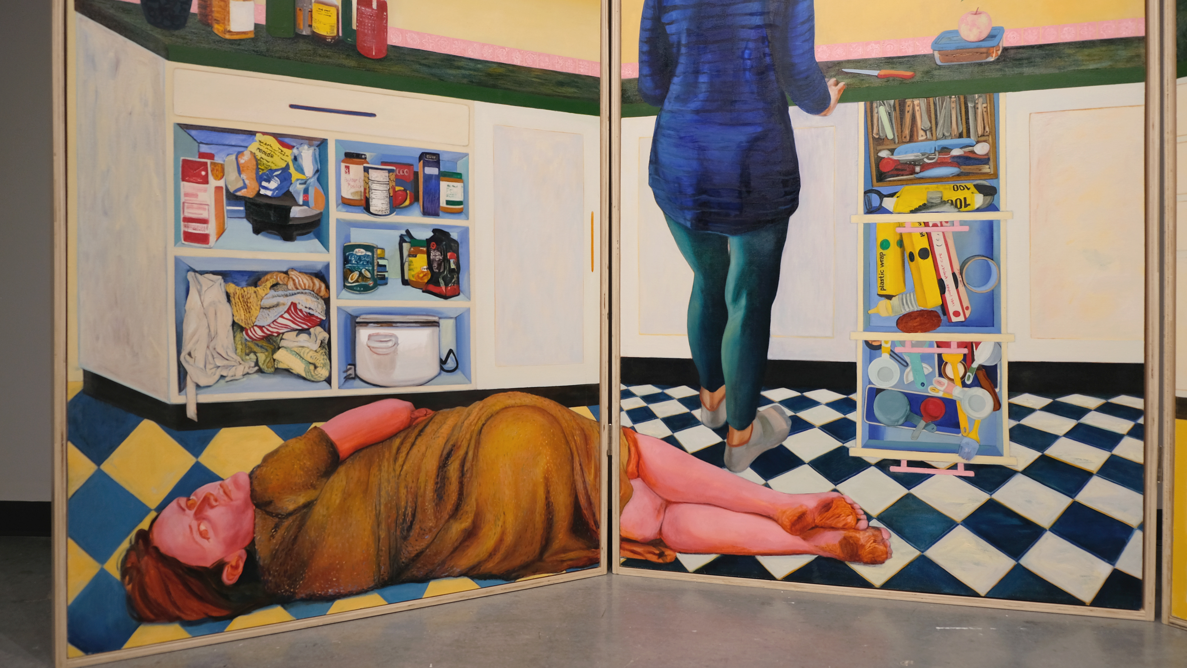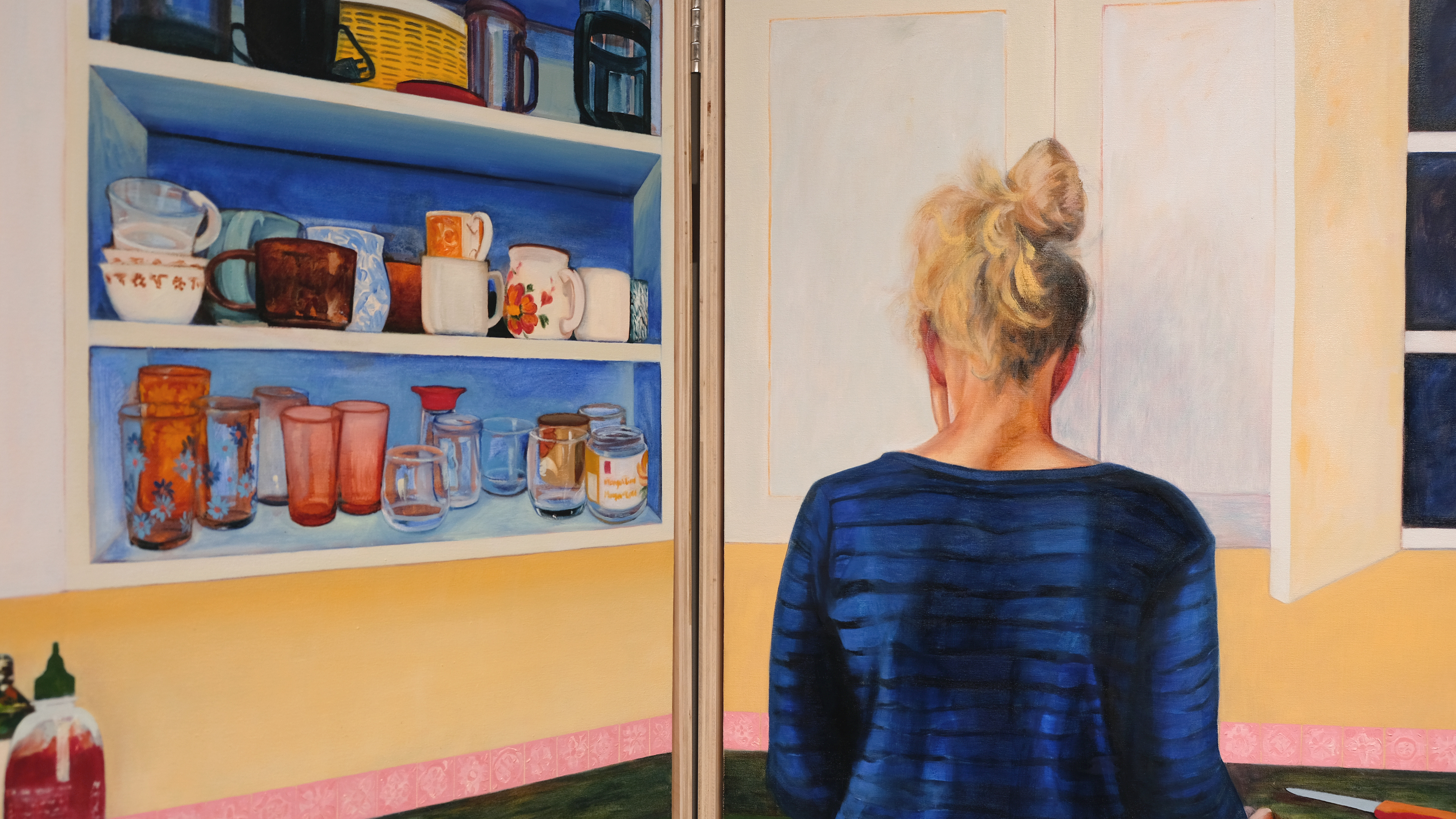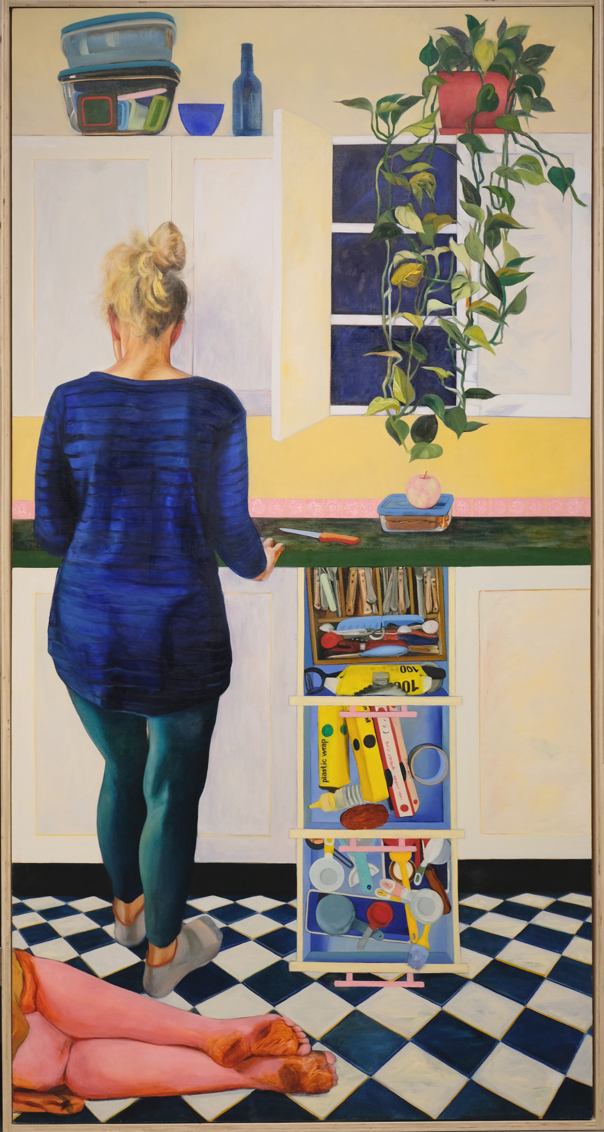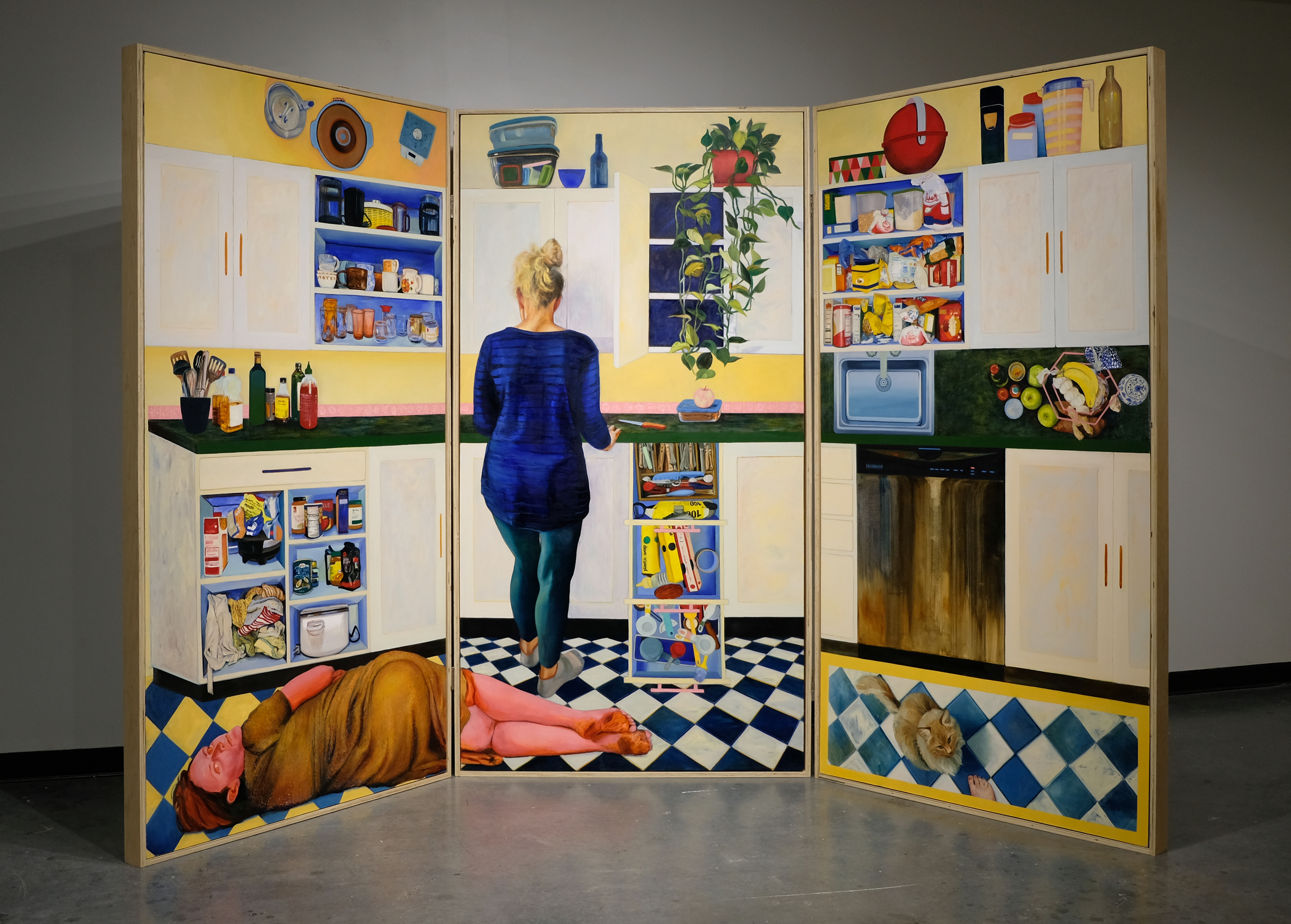 Alcove (Marie in the kitchen). Oil on canvas in free-standing hinged plywood frame. Each of 3 panels 4' x 7' 8". 2019.