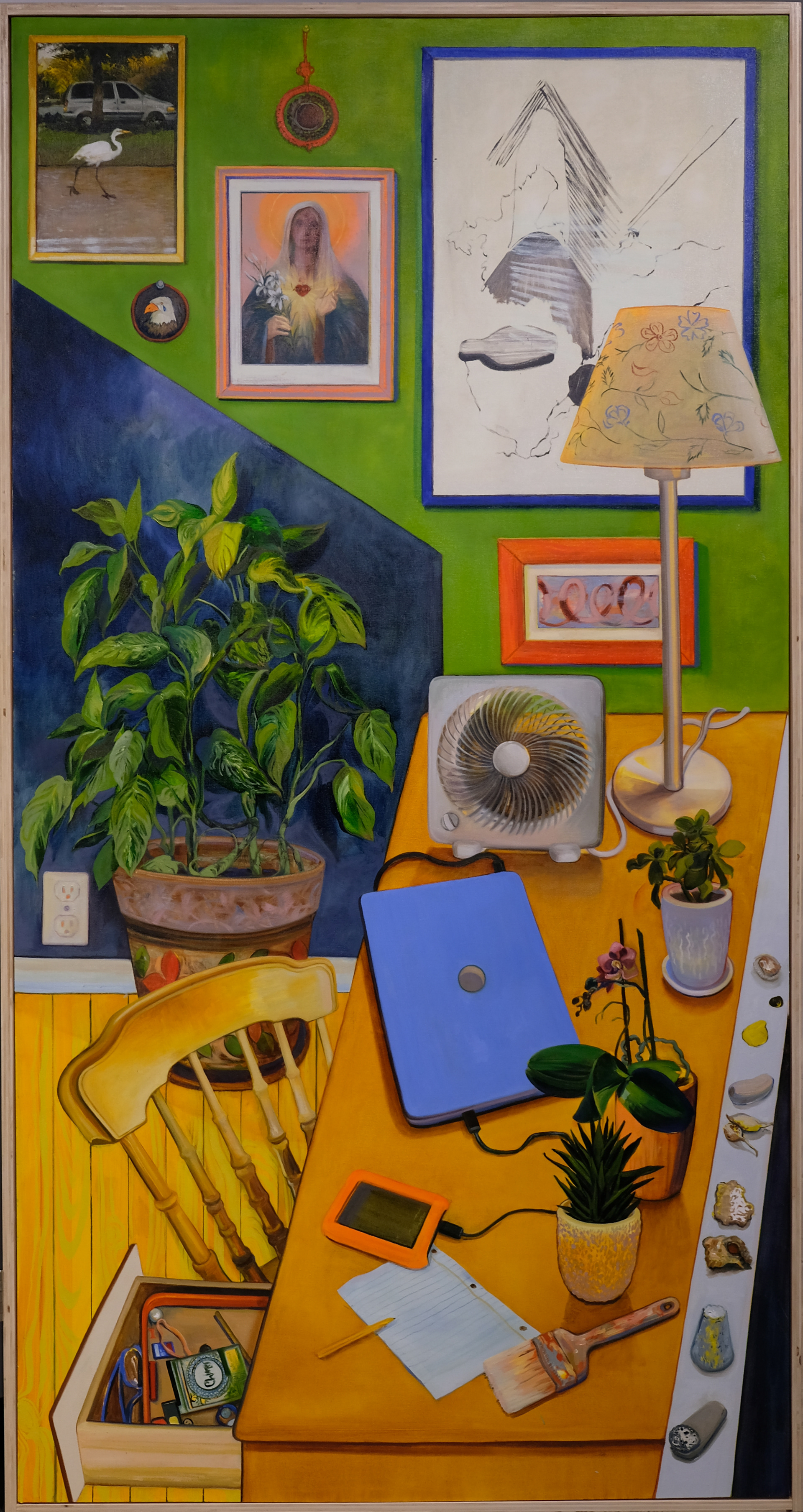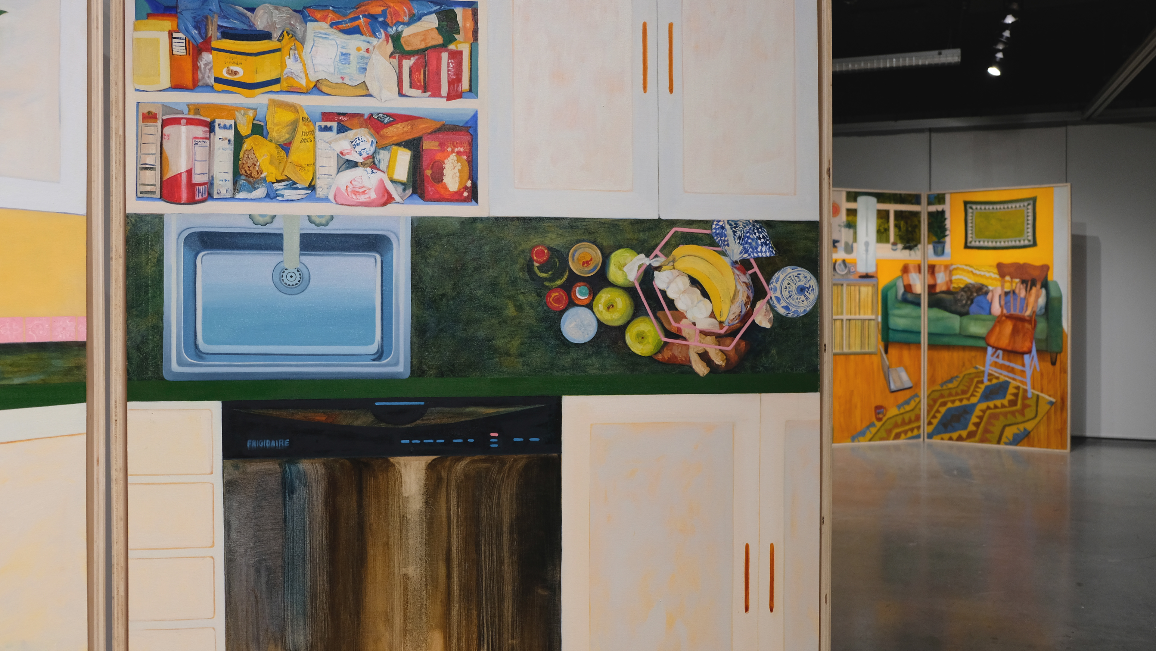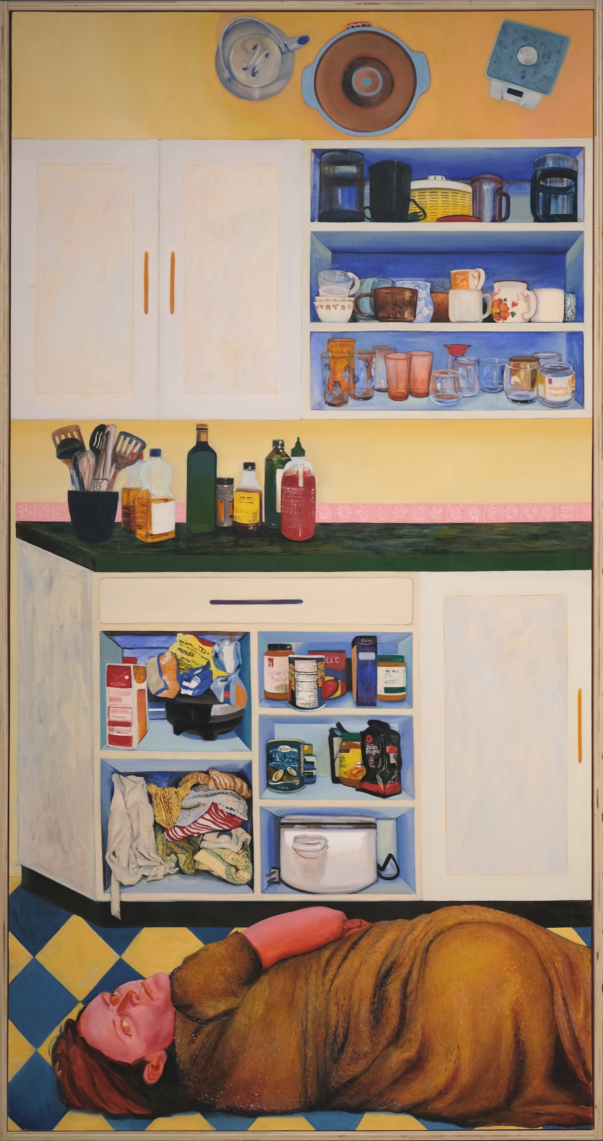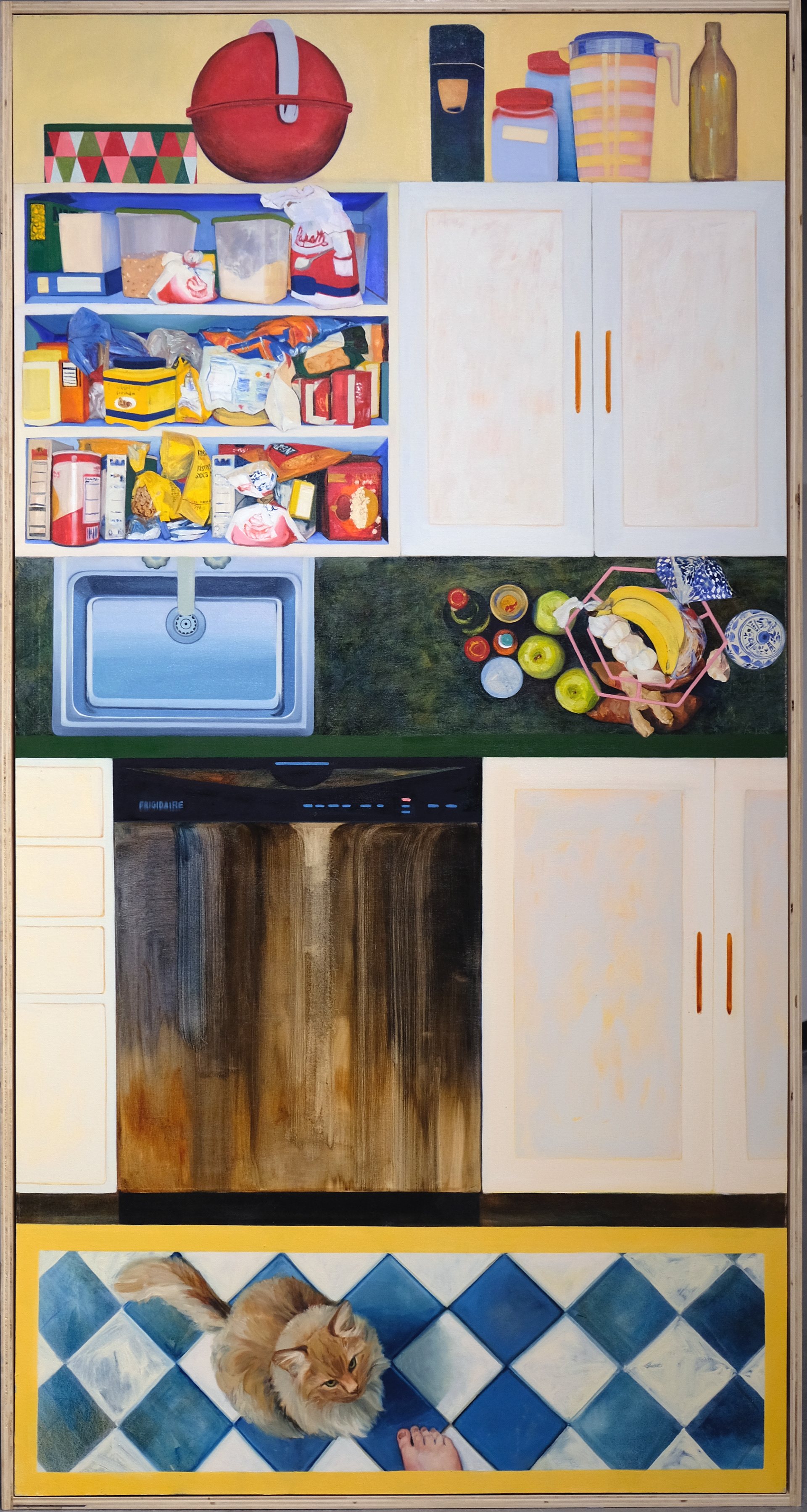 Alcove (Marie in the kitchen). Oil on canvas in free-standing hinged plywood frame. Each of 3 panels 4' x 7' 8". 2019.