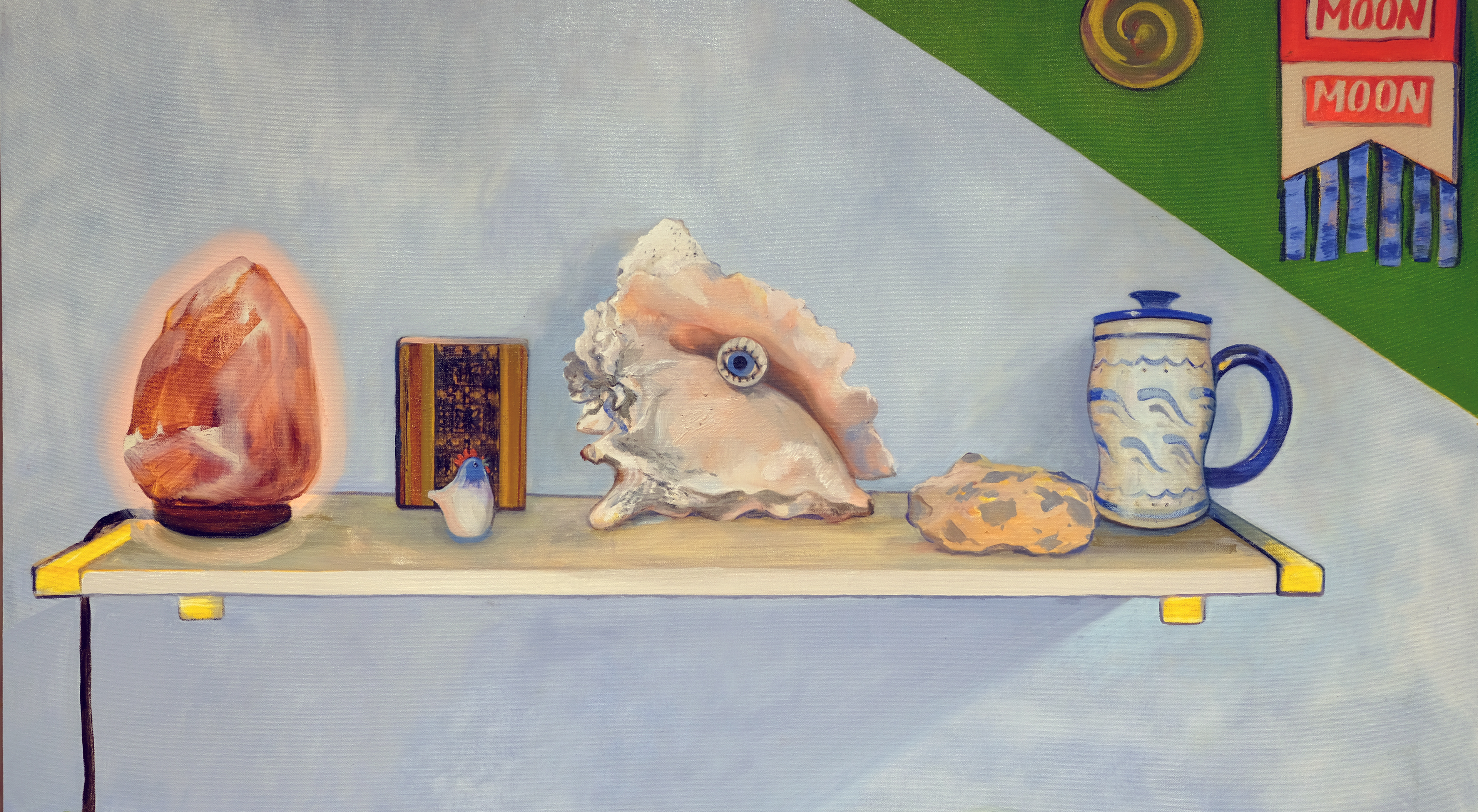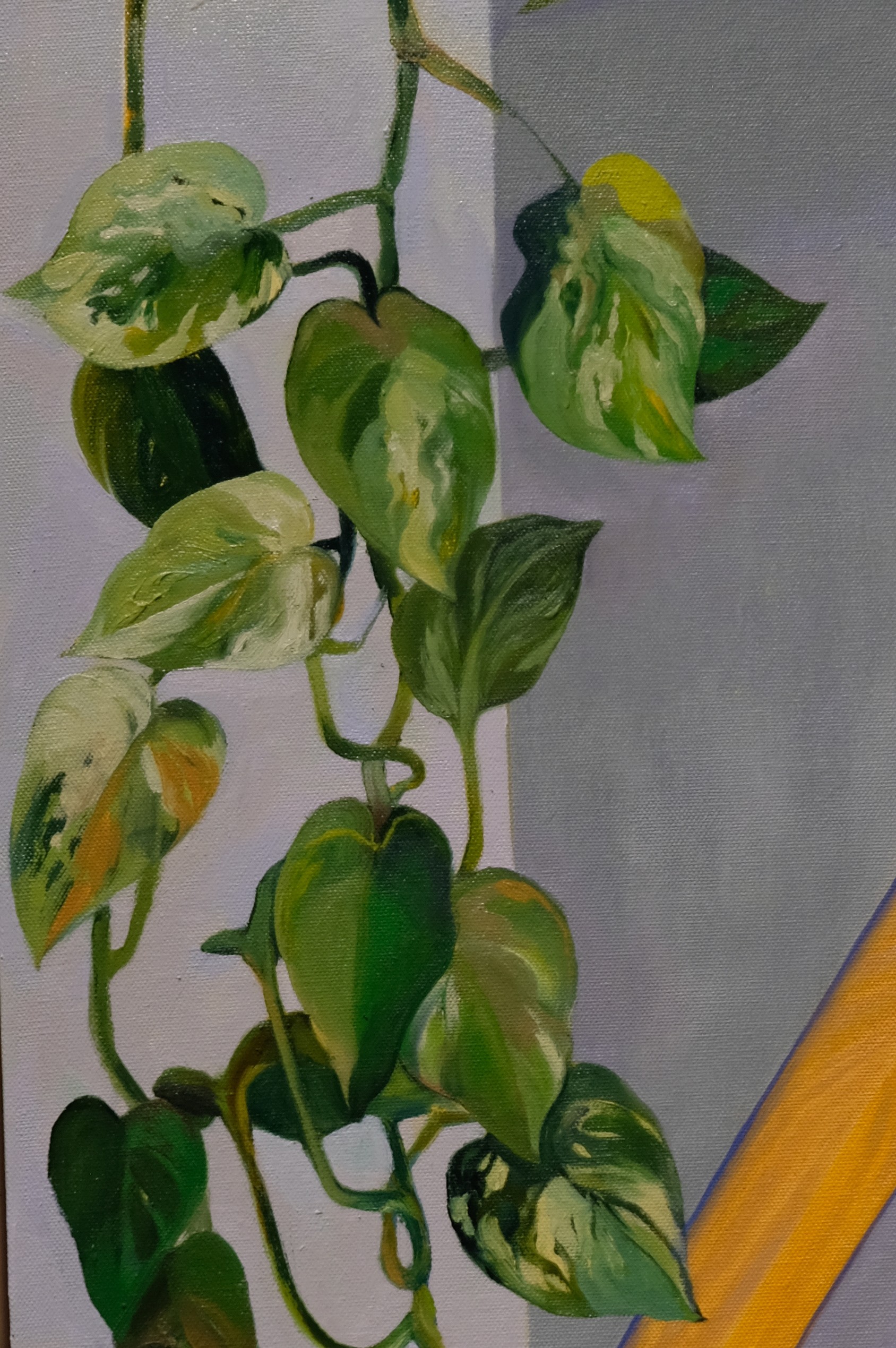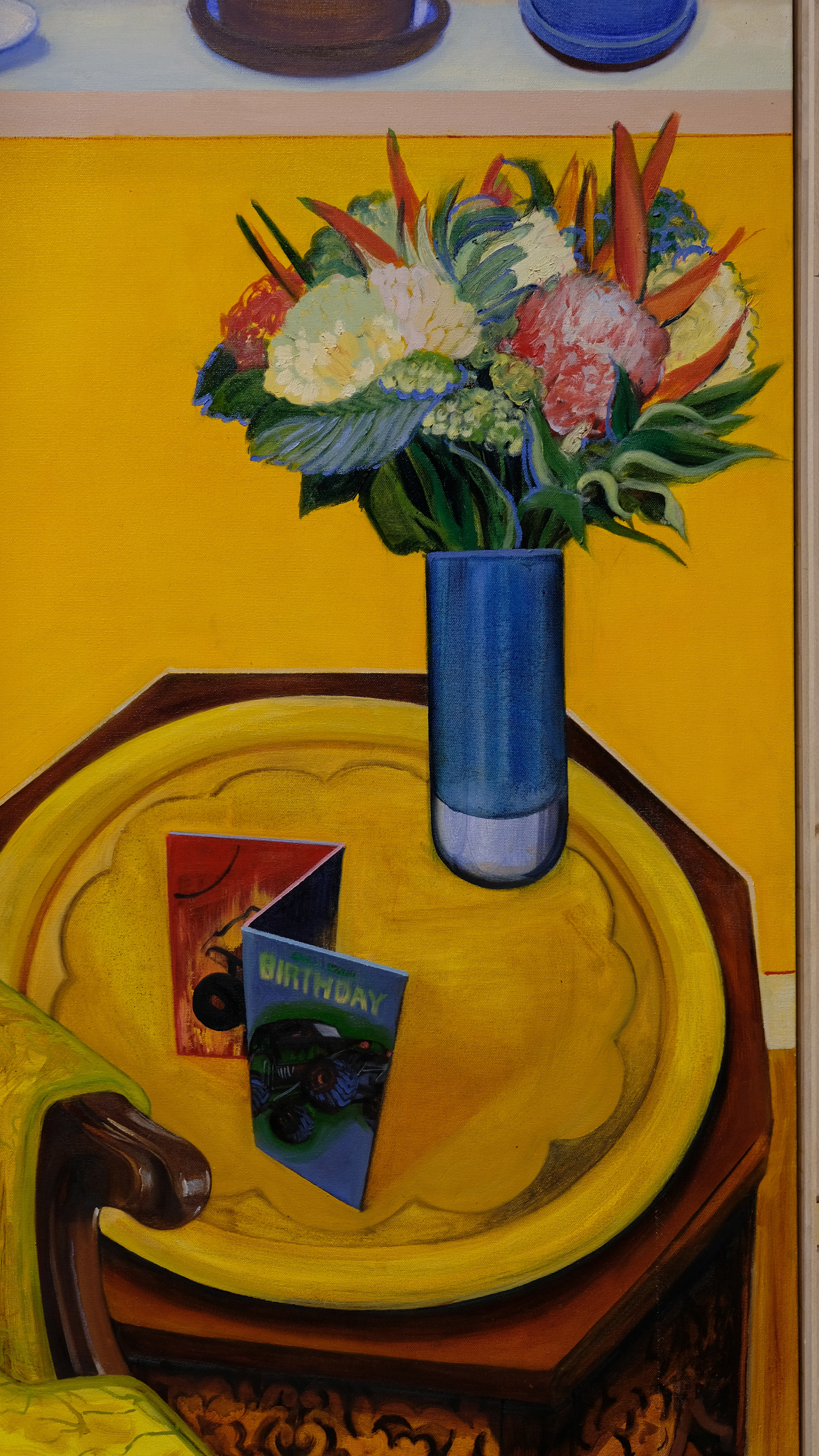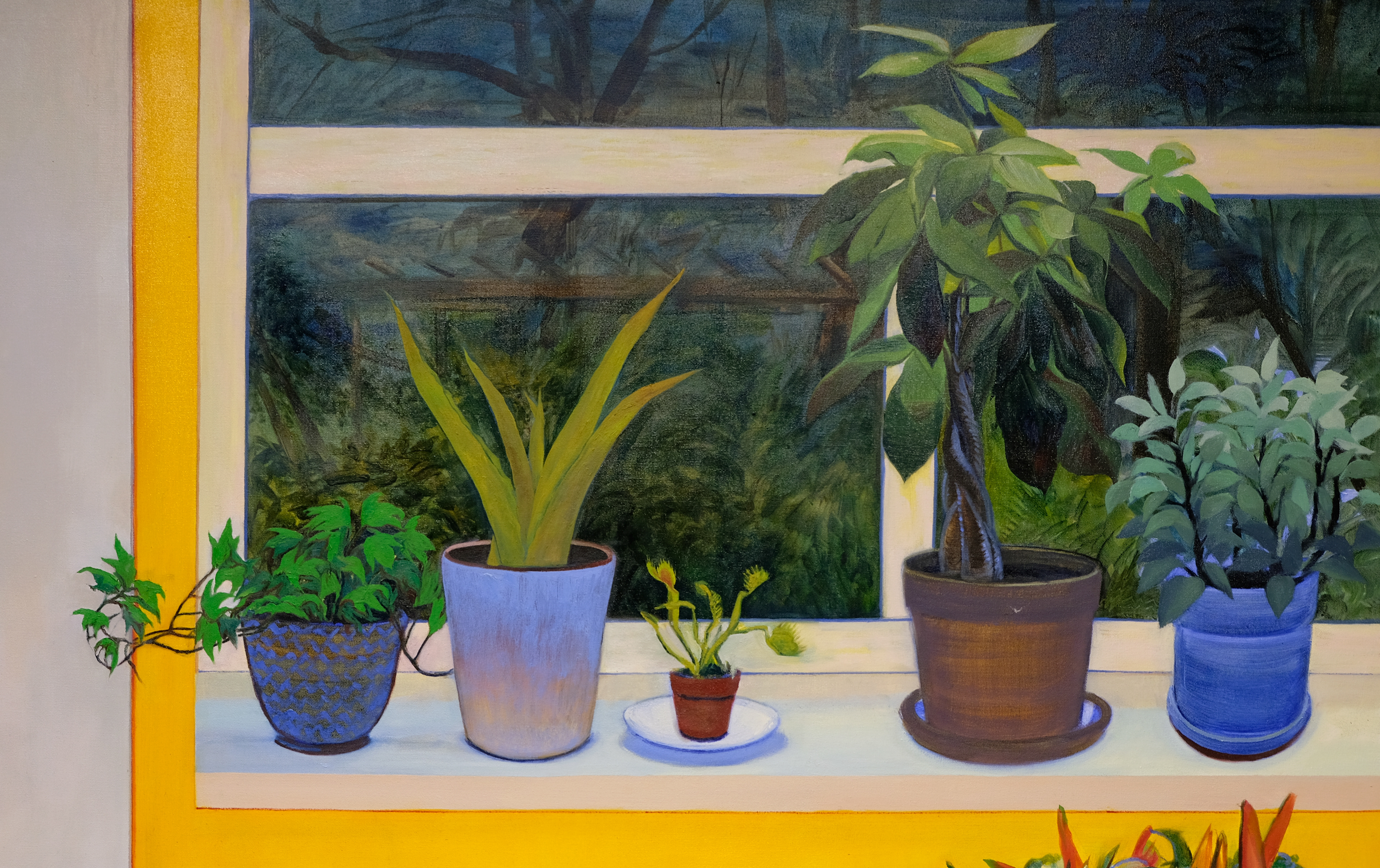 Alcove (Marie in the kitchen). Oil on canvas in free-standing hinged plywood frame. Each of 3 panels 4' x 7' 8". 2019.