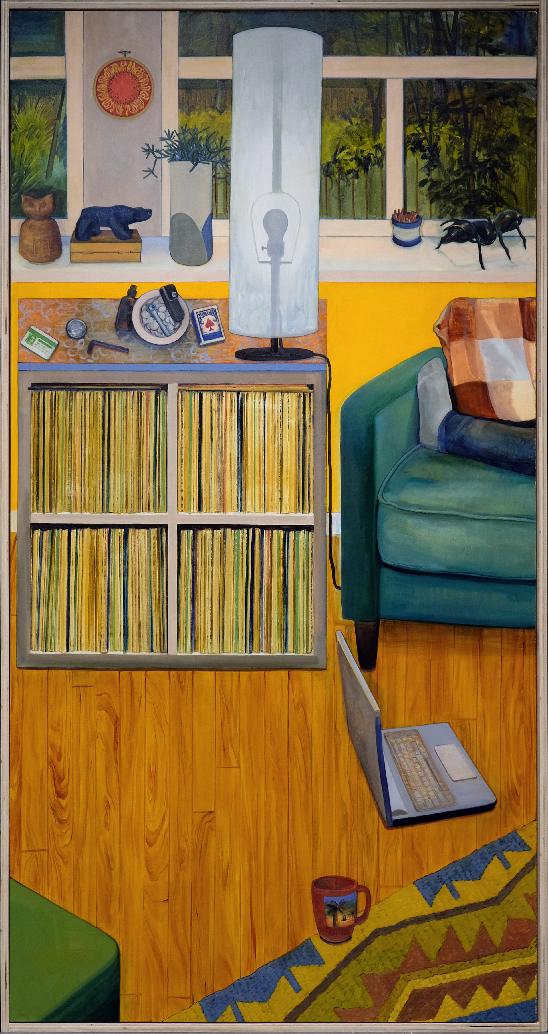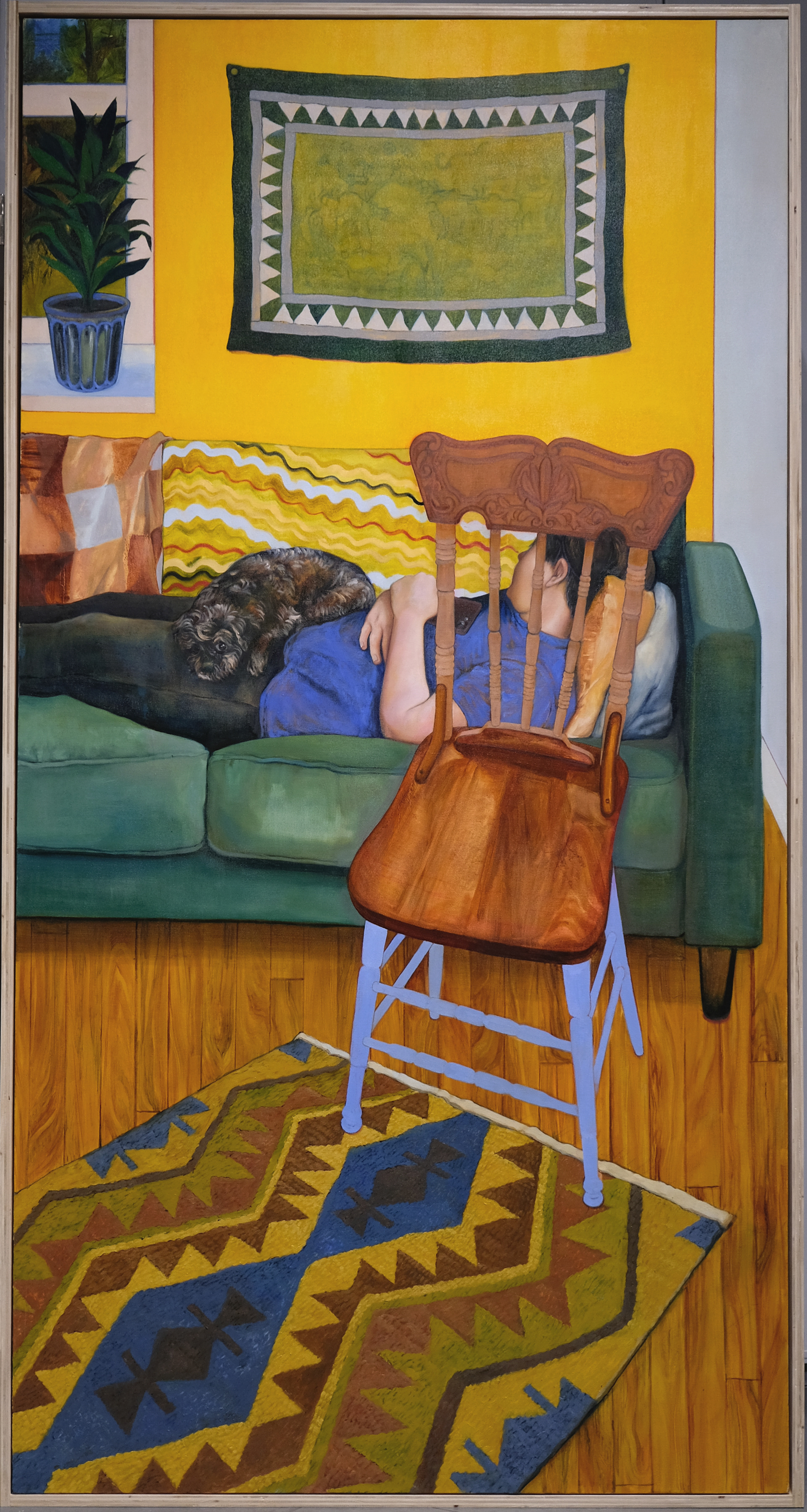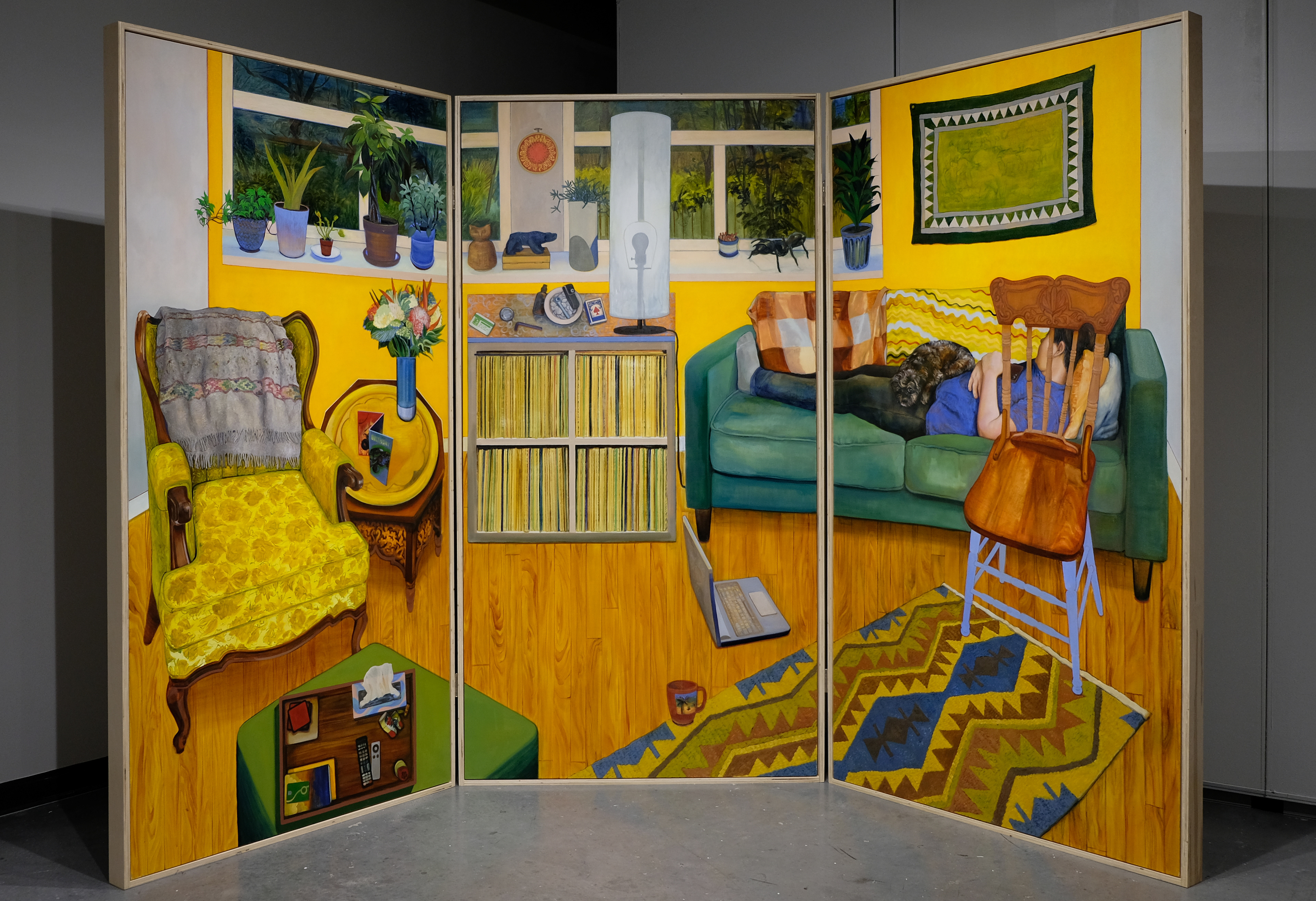 Alcove (Lauren and Frank in the living room). Oil on canvas in free-standing hinged plywood frame. Each of 3 panels 4' x 7' 8". 2020.