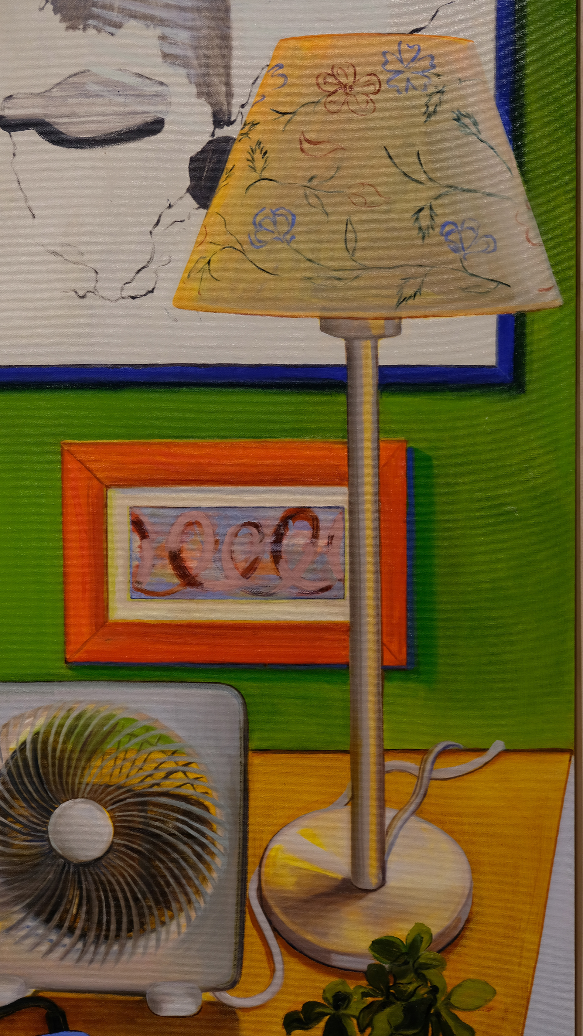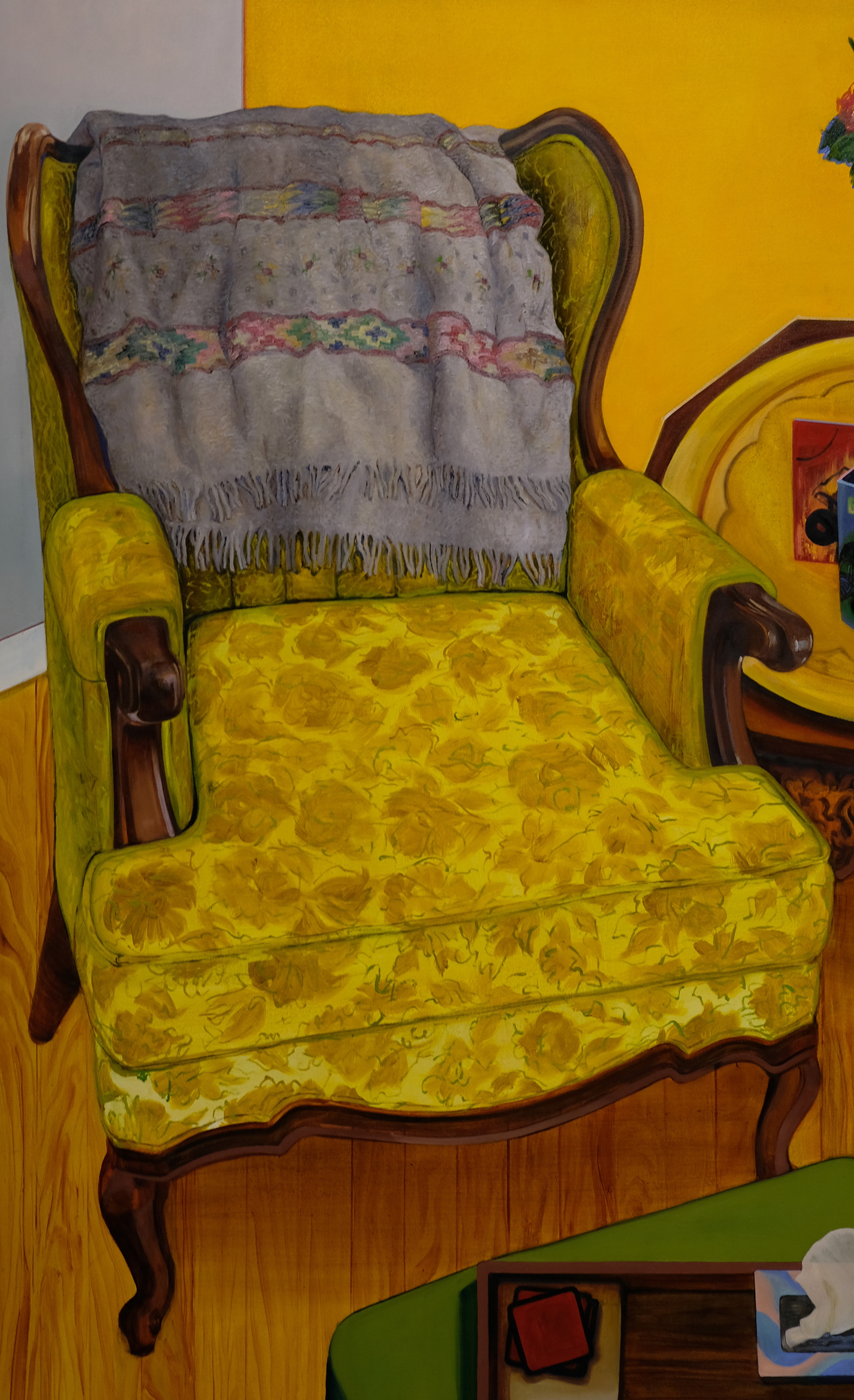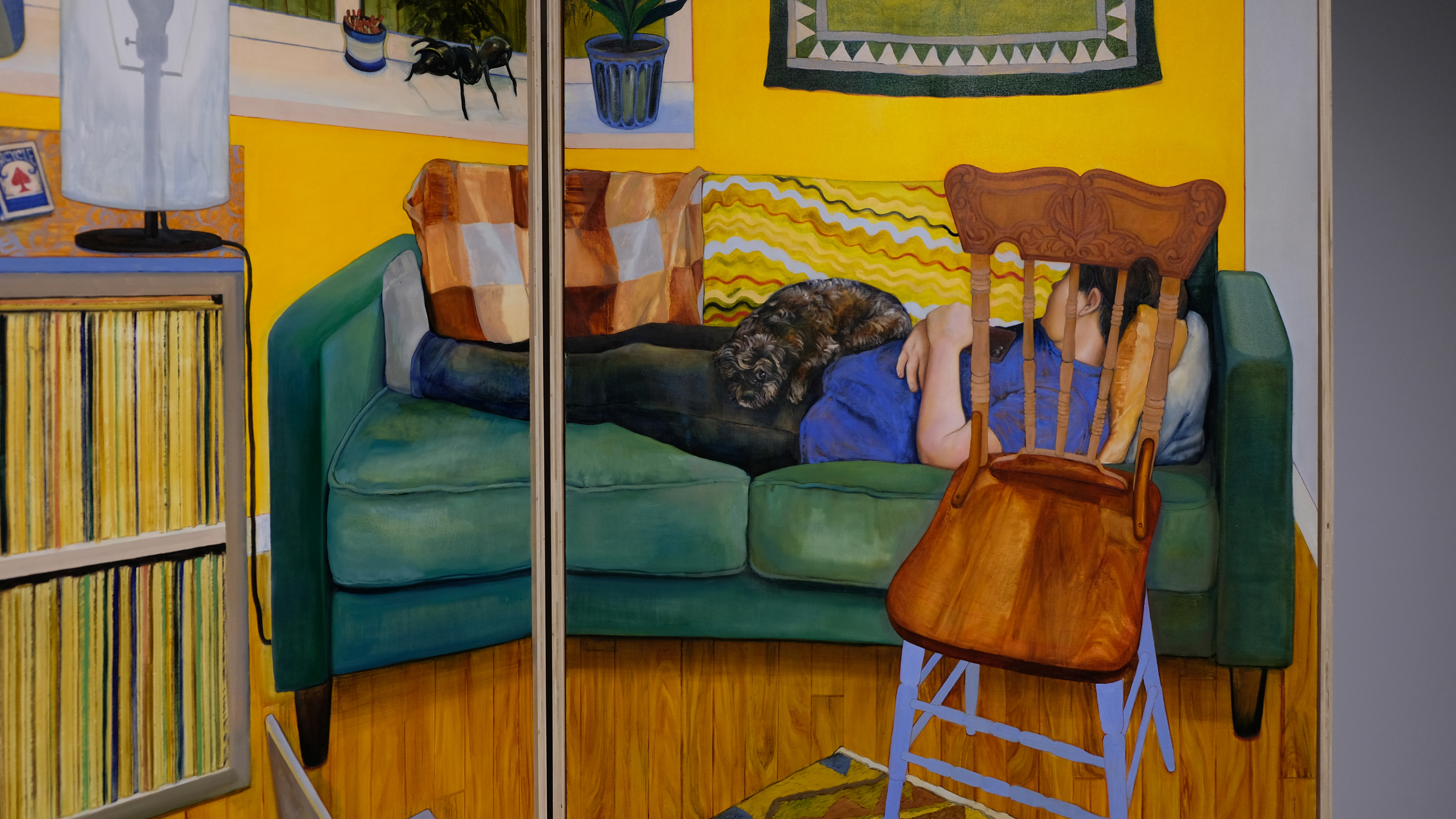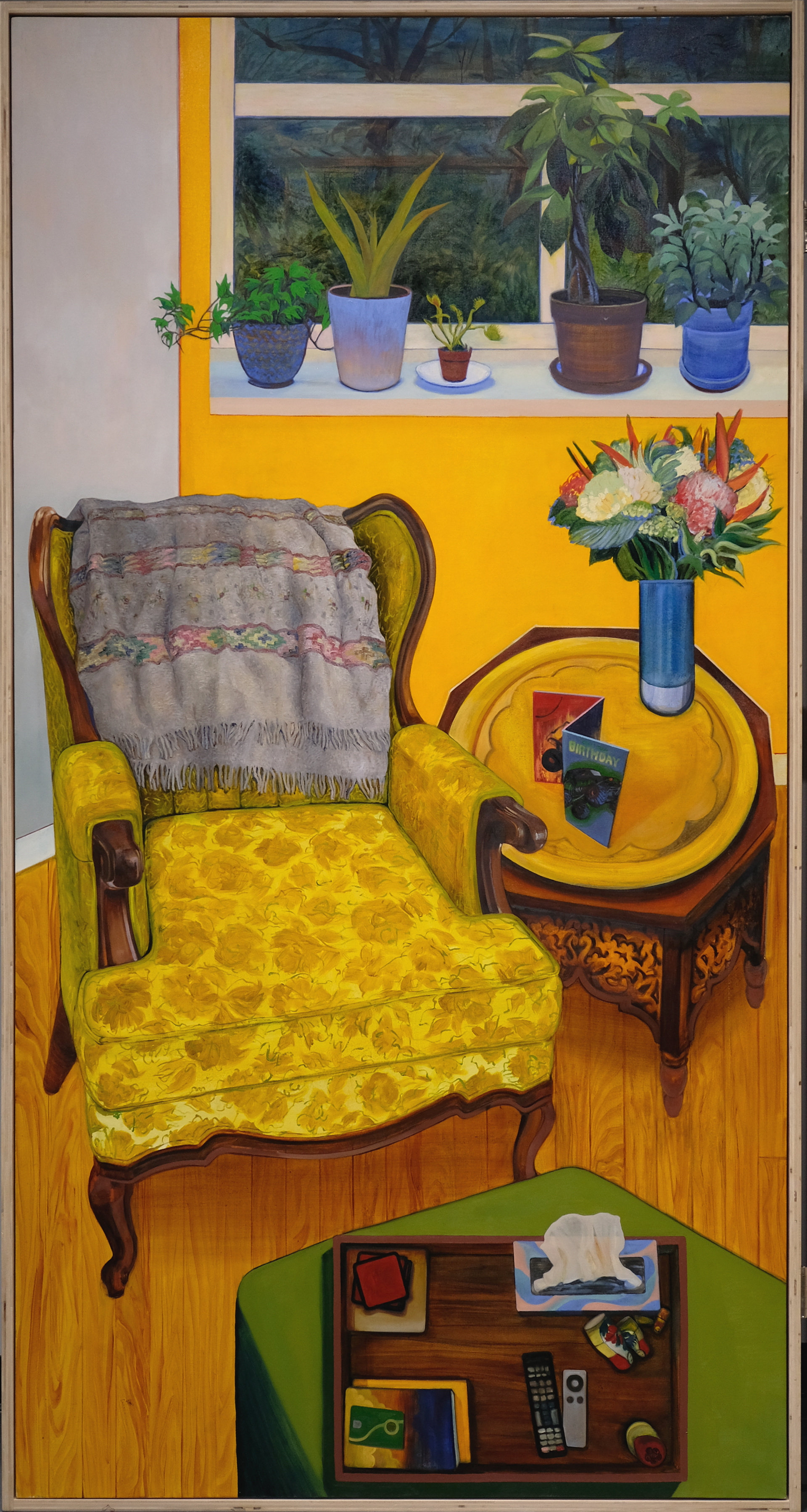 Alcove (Lauren and Frank in the living room). Oil on canvas in free-standing hinged plywood frame. Each of 3 panels 4' x 7' 8". 2020.