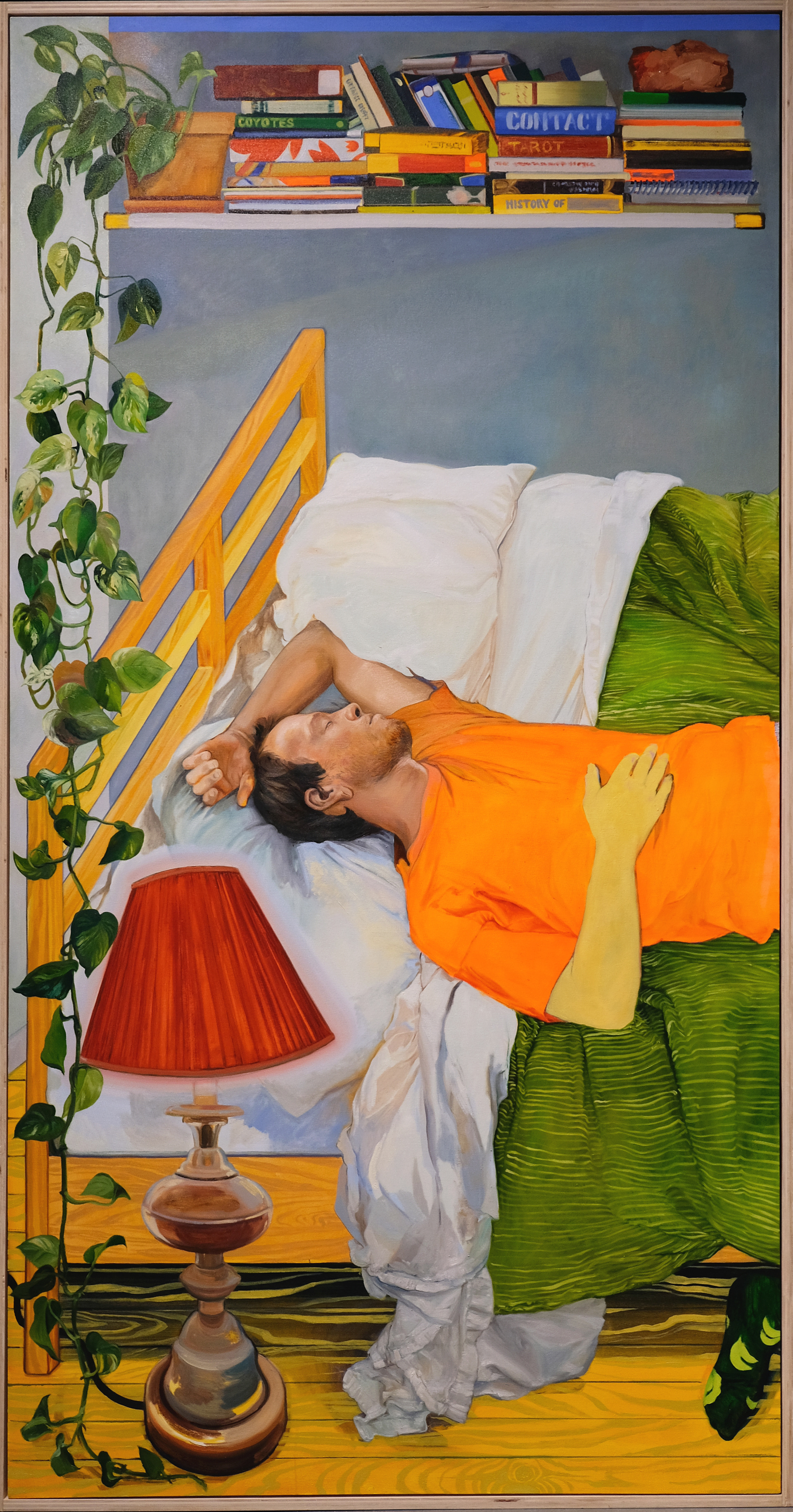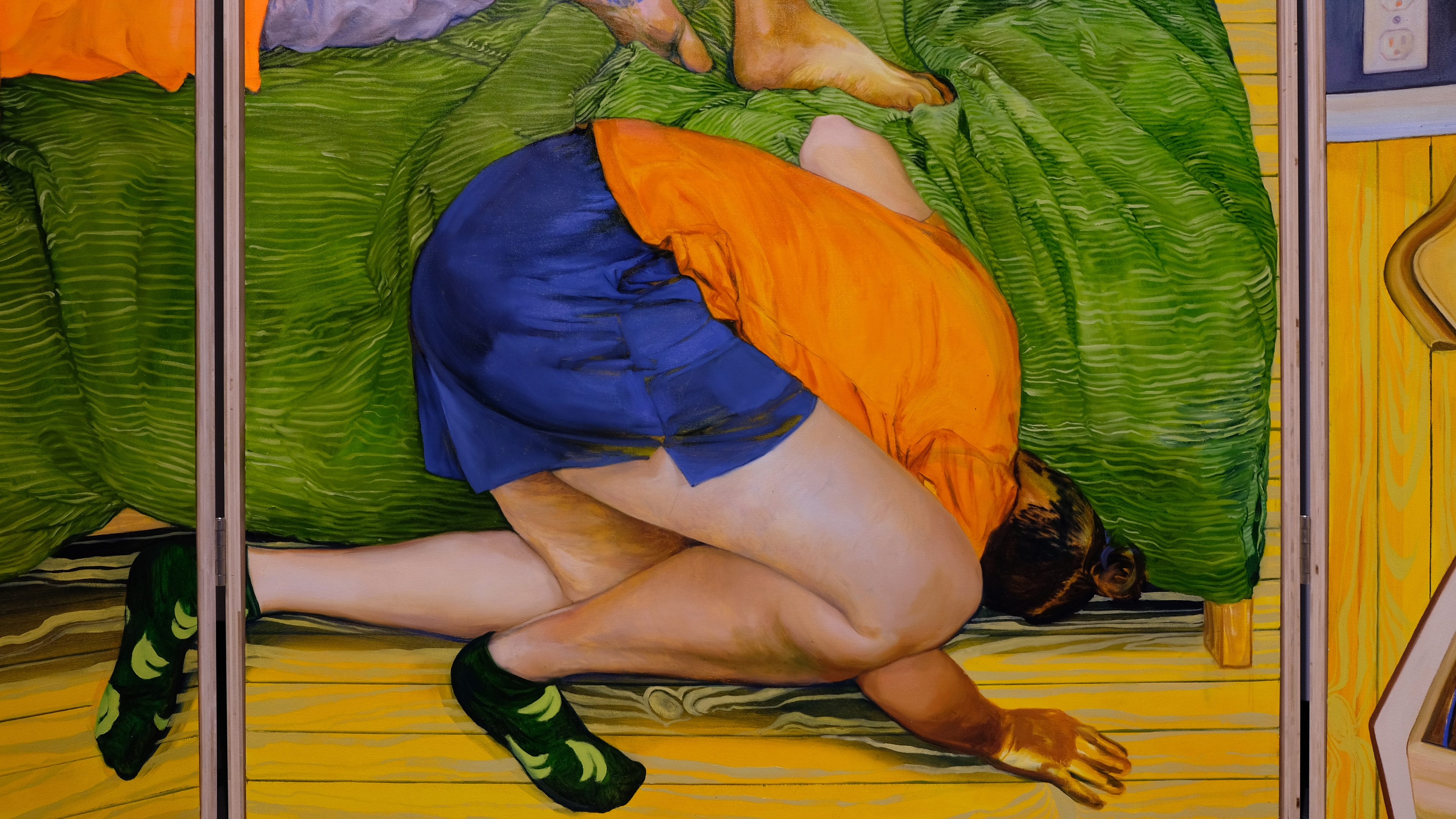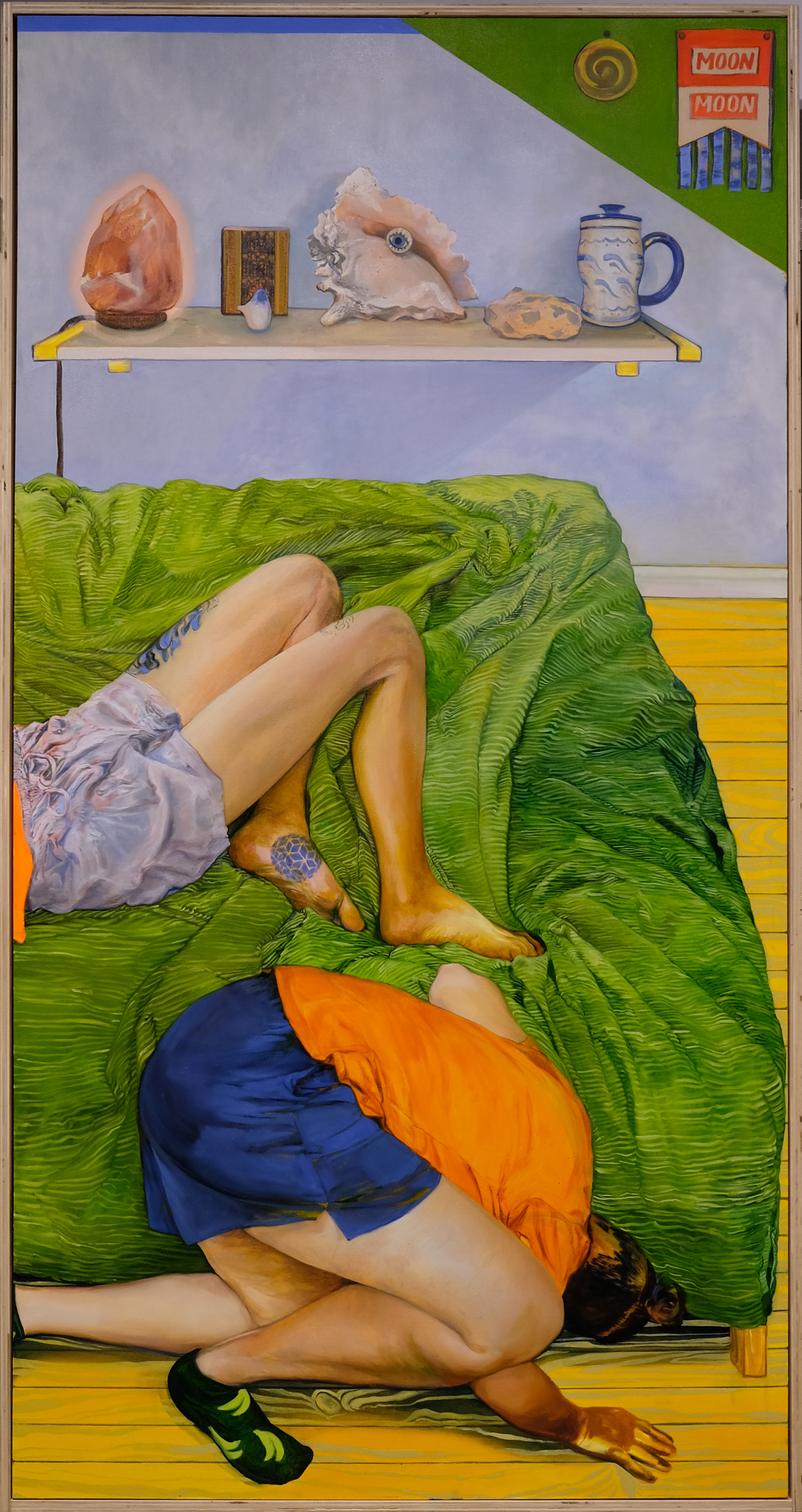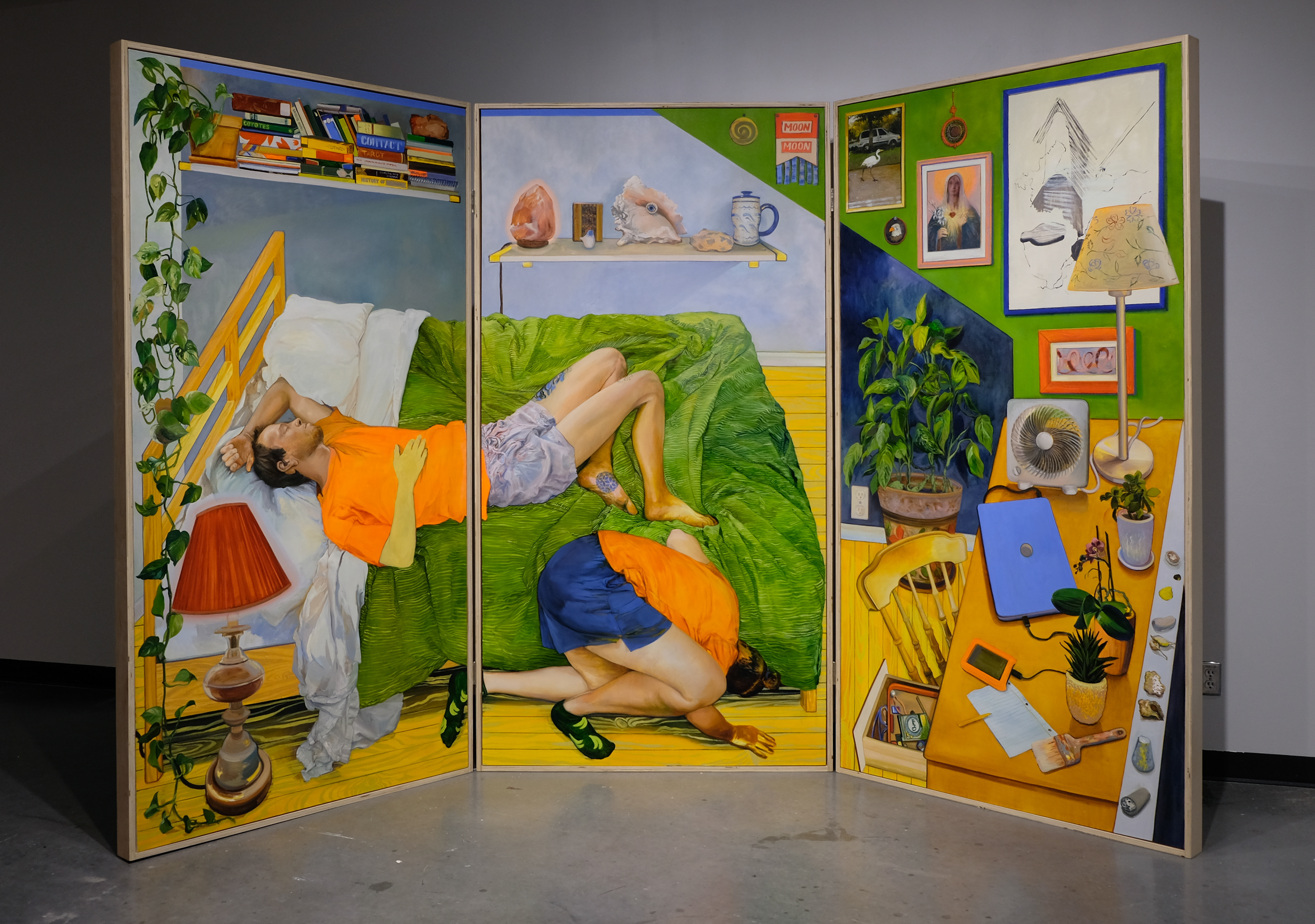 Alcove (Tim and Lauren in the bedroom). Oil on canvas in free-standing hinged plywood frame. Each of 3 panels 4' x 7' 8". 2021.
