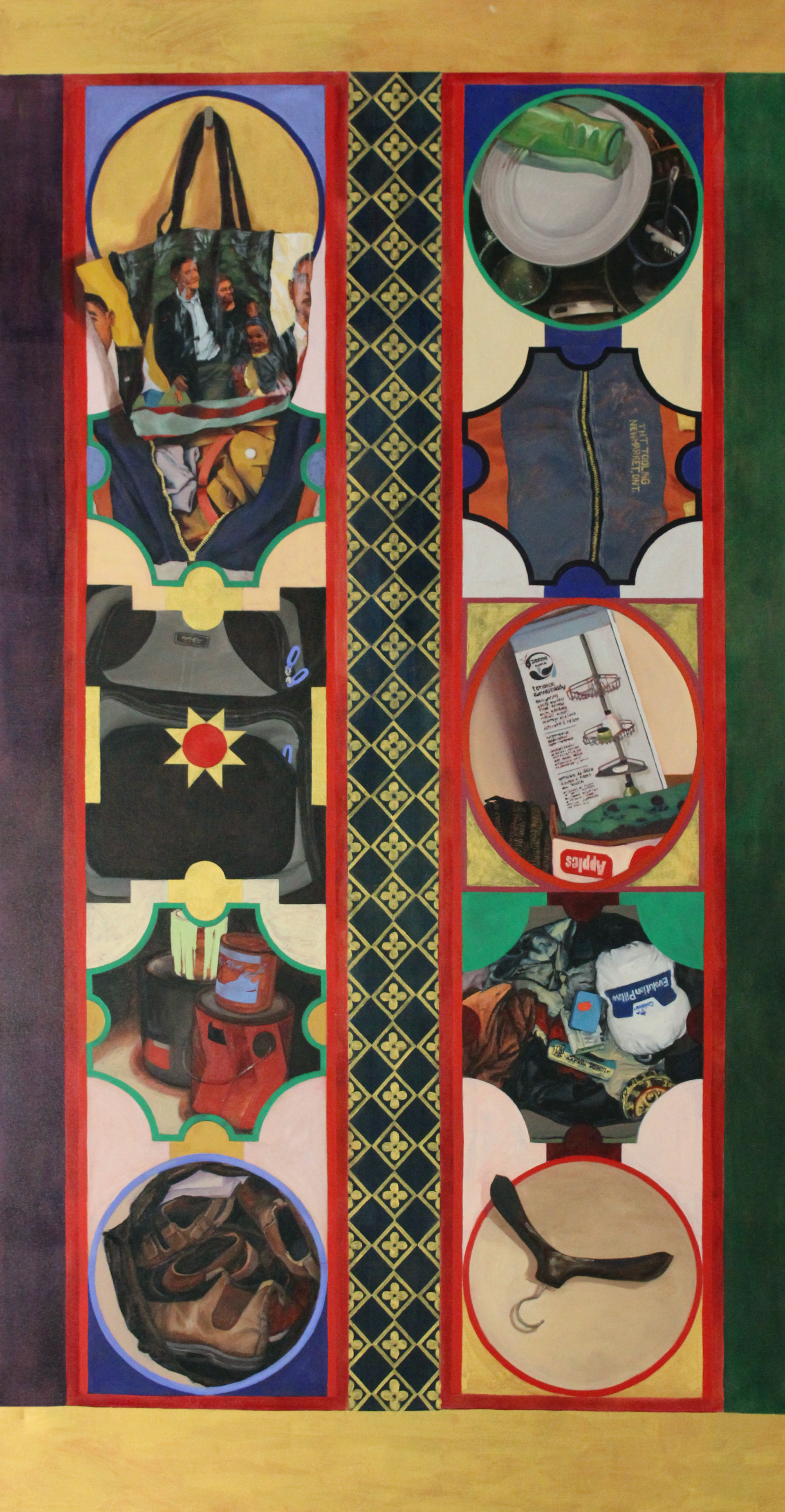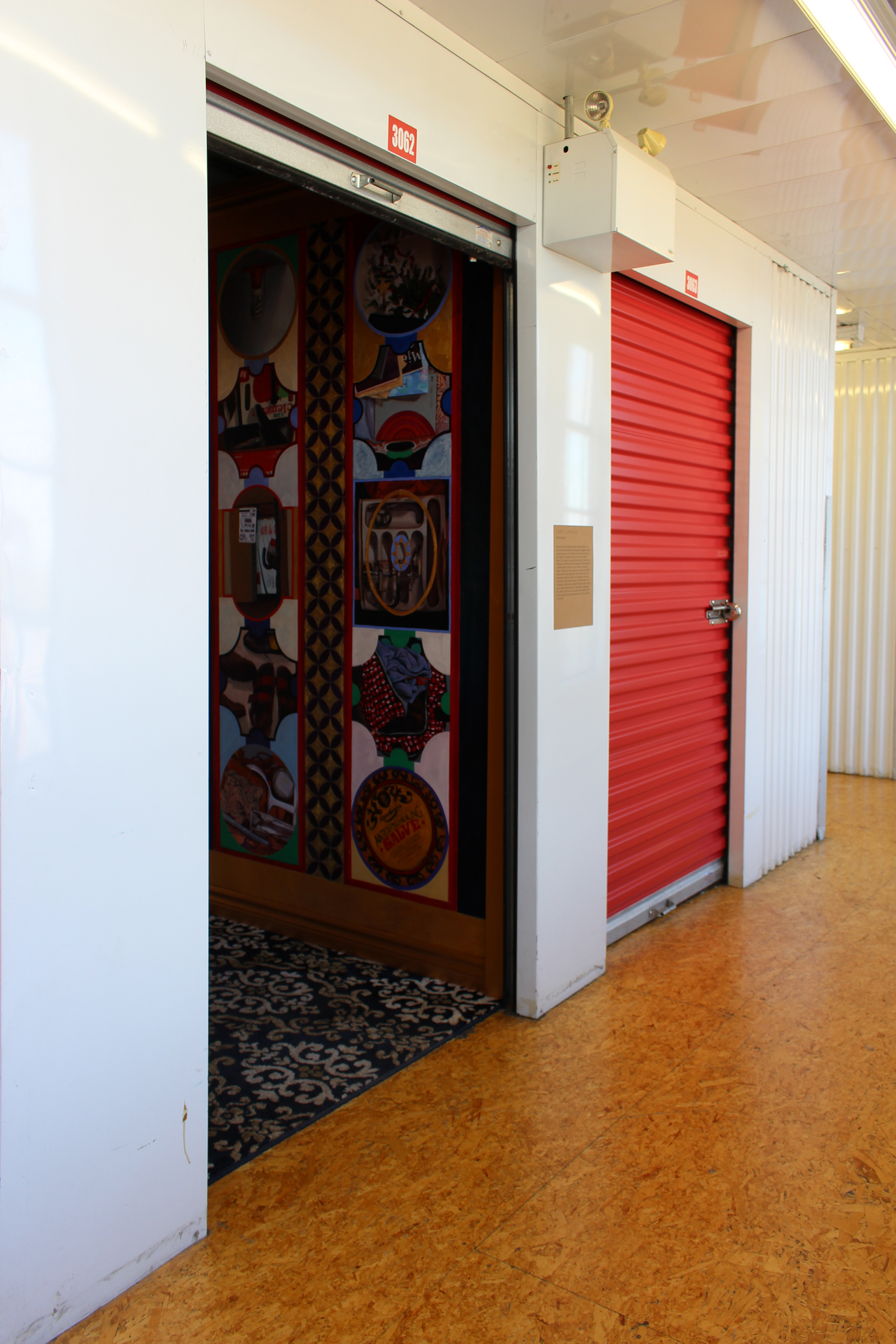 Detritus Salon. Oil on canvas, mouldings, carpet. 5' x 5' x 8'. Installed in a storage locker at Planet Storage, Toronto, for ArtSpin project 'Holding Patterns'. 2018.